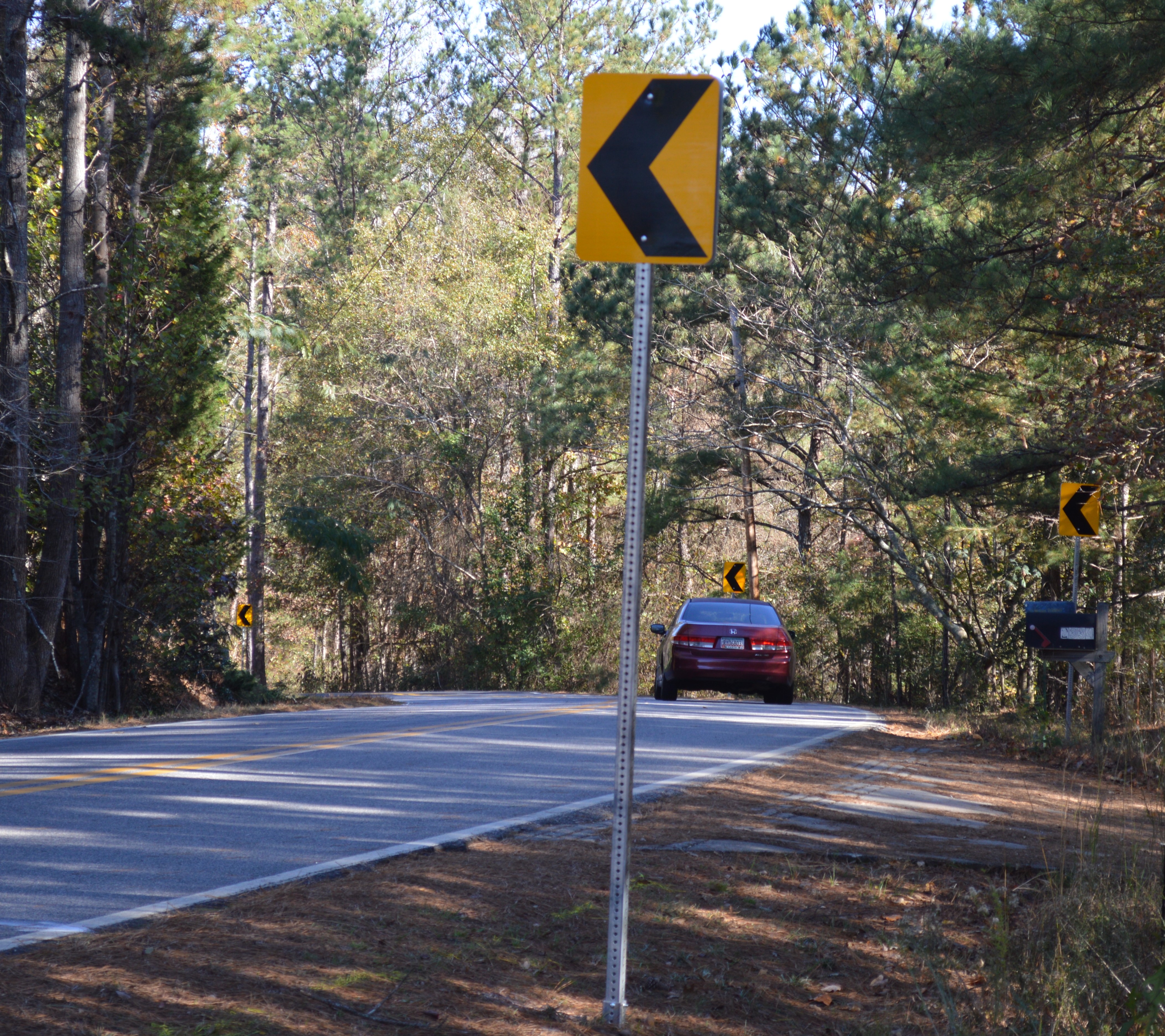 After several accidents in the "s" curve on South New Hope Church Road, we were able to have reflective chevron directional signs installed in both the south and north bound lanes. These new signs will enable motorists to better identify the sharp curve in the roadway at this location. This problem area was brought to the Mayor’s attention by a resident who lives in the area.