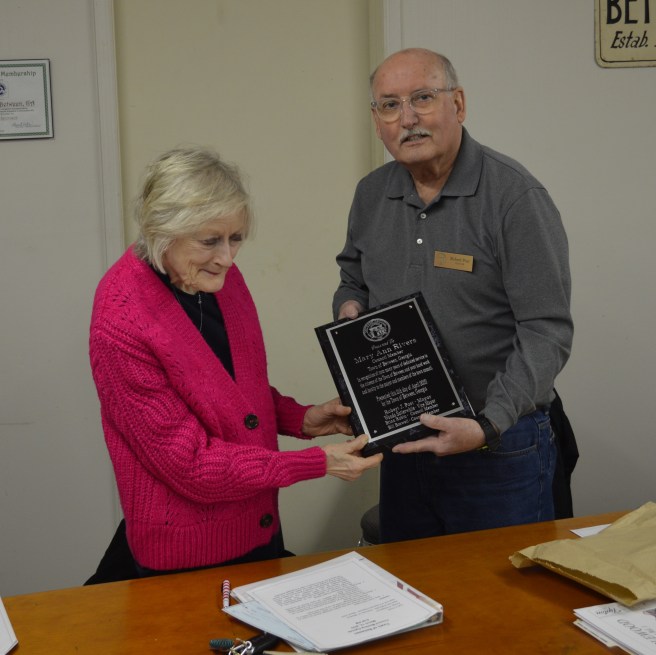 At the March 14, 2023 Town of Between Council Meeting, Council Member Mary Ann Rivers submitted her resignation as a member of the council effective April 1, 2023. Mary Ann has served the citizens of Between since 2013. Mayor Robert Post presented her a service plaque recognizing her service to the town.