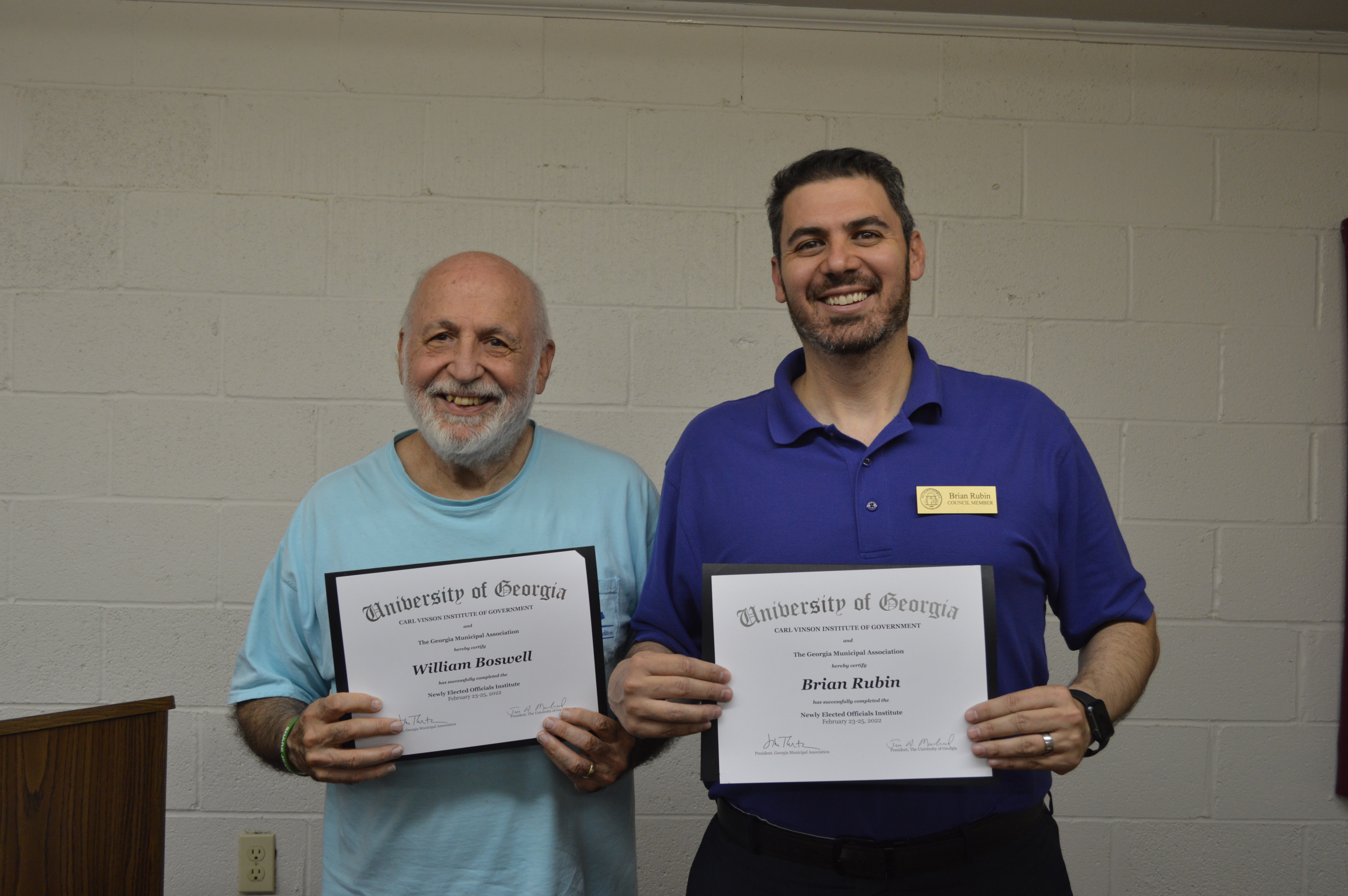 Councilmembers Brian Rubin and William Boswell were recognized at the August 9, 2022 Town of Between Council Meeting for successful completion of the Newly Elected Officials Institute training program hosted by the University of Georgia, Carl Vinson Institute and the Georgia Municipal Association. This three day training program is required for all newly elected officials by the State of Georgia. The Town of Between now has four of our five elected officials certified.